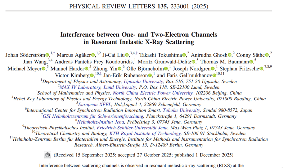 近日,我校数理学院刘纪彩教授团队与瑞典乌普萨拉大学、隆德大学、瑞典皇家工学院、欧洲XFEL等多个国际知名实验团队合作,在物理学领域顶级期刊Physical Review Letters上发表了《Interference between One- and Two-Electron Channels in Resonant Inelastic X-Ray Scattering》学术论文,刘纪彩教授为论文的共同通讯作者(理论工作),博士生王翦参与论文的计算模拟。